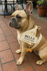 Your pup’s name + phone number is front and center. Elegant serif lettering, high-contrast patch, and quick readability – so style meets real-world safety on every walk.